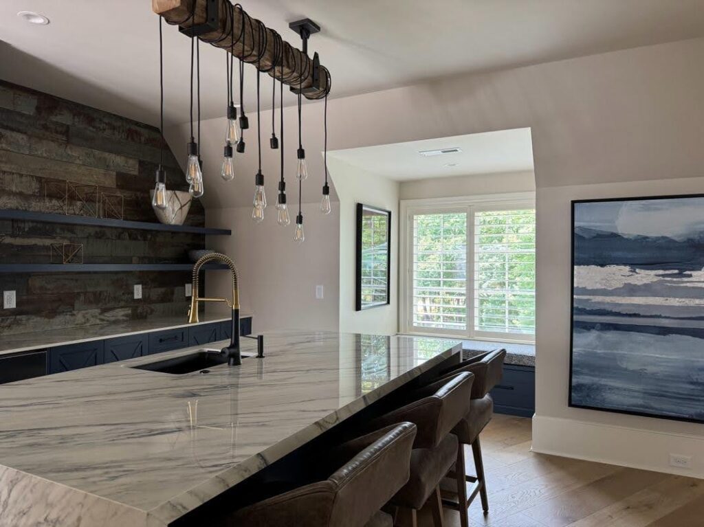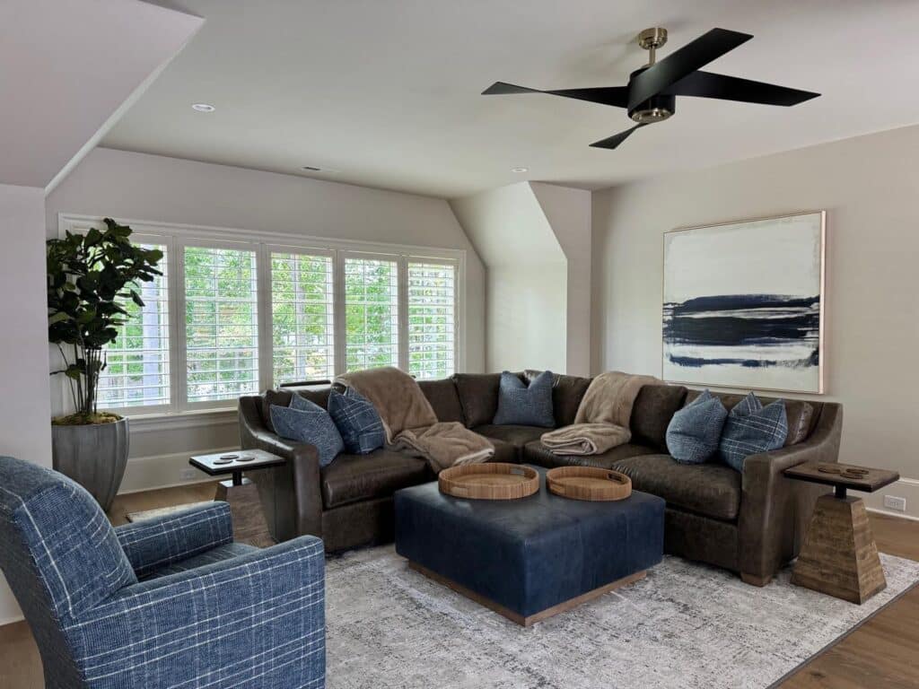This sophisticated new construction home on Lake Norman features a combination of window treatments: Lutron motorized shades with smart home technology, Elite’s 3 ½” interior shutters, and custom draperies. The mixed approach establishes personality, function, and light control throughout the home.