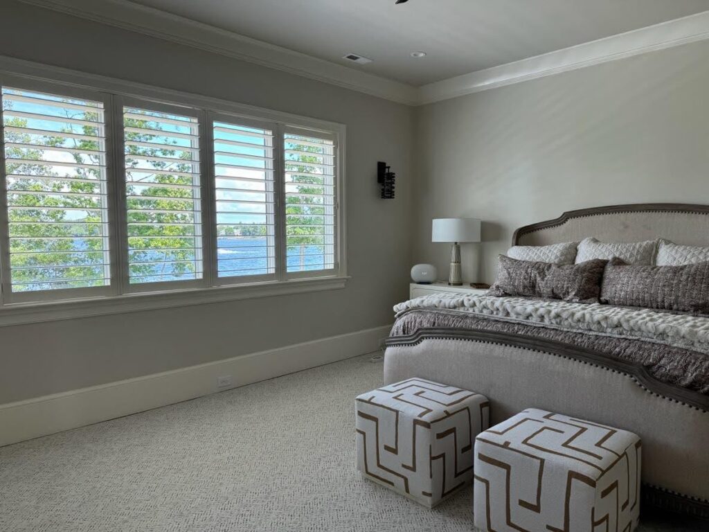 The primary bedroom (below) features functional drapery and Lutron roller shades. The drapery softens the room, adds texture and color, and blacks out the room when drawn. The Lutron shades maintain the lake view throughout the day, or buffer the sun when needed.