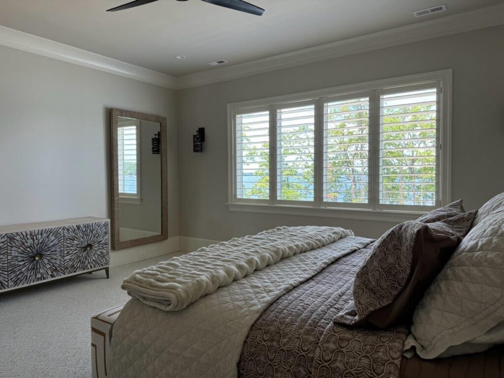 A common misconception about interior shutters is that they block views and darken the space. While this can be true for some traditional styles, Elite’s shutters can be built in a contemporary style. This style features larger louvers – such as 3 ½” or 4 ½” [link to galleries] – and a clear view without a tilt rod (called Rear Tilt or Hidden Tilt). The louver size and clear view provide ample light and protect the view, as can be seen in this lakeside guest bedroom: